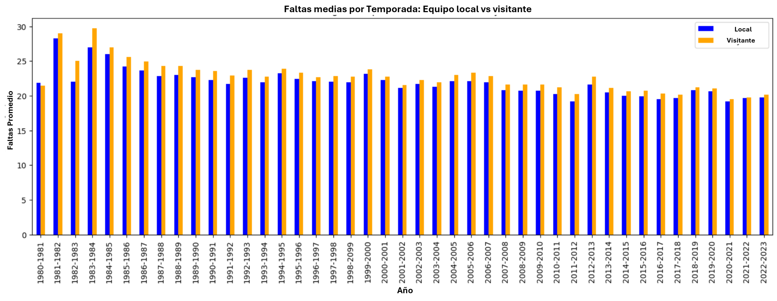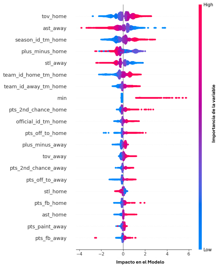 Entre las principales variables que influyen en la predicción de faltas, las pérdidas del equipo local son la más determinante: un mayor número de pérdidas genera predicciones de más faltas, ya que frecuentemente el equipo contrario comete una falta para frenar la posesión o el contraataque, incluyendo las faltas ofensivas. En segundo lugar, las asistencias del equipo visitante tienen un efecto inverso: más asistencias suelen traducirse en más canastas y, por tanto, en menos faltas sobre el equipo local. La temporada del partido también es relevante, reflejando la evolución del estilo de juego y los criterios arbitrales a lo largo de los años, con un descenso general de faltas en los últimos 20–25 años.