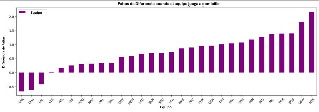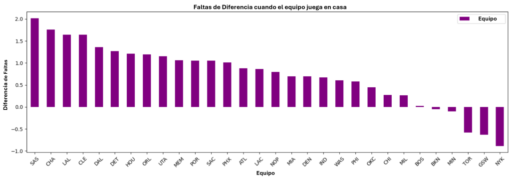 Al analizar el diferencial de faltas según la localía, se observa que equipos como San Antonio Spurs, Charlotte Hornets y Los Angeles Lakers han sido históricamente los más beneficiados cuando juegan en casa, mientras que franquicias como Golden State Warriors, Toronto Raptors y New York Knicks tienden a recibir más faltas que sus rivales en esa misma condición.