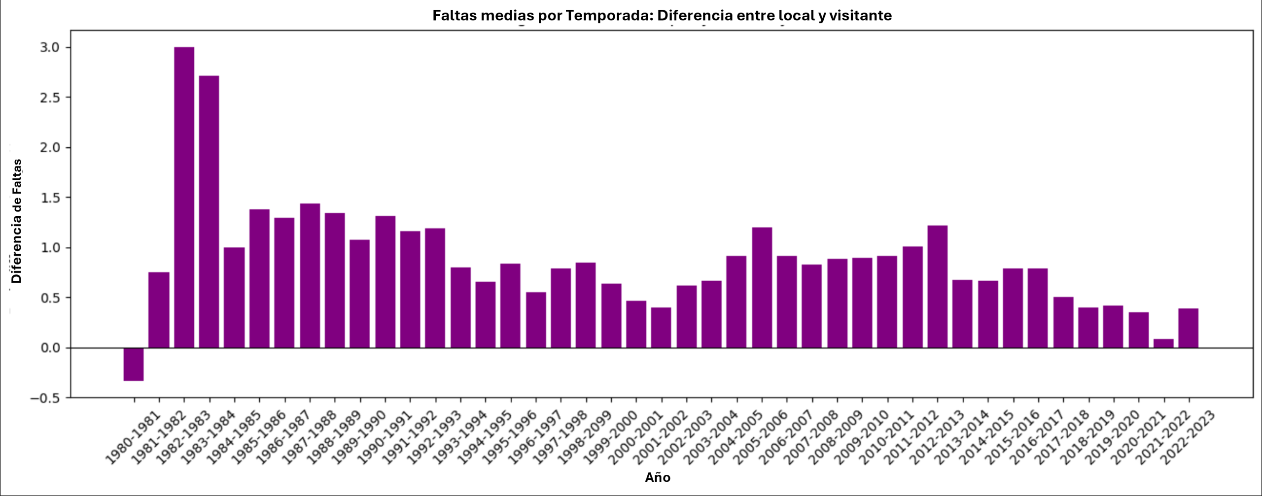 Desde la década de 1980, el número total de faltas personales por partido ha experimentado una reducción significativa, de en torno al 25–30 %. Además, los equipos que juegan como visitantes suelen recibir más faltas personales que los locales, un fenómeno que podría estar parcialmente influido por la presión del público sobre el comportamiento arbitral. No obstante, esta diferencia entre faltas señaladas a equipos locales y visitantes fue especialmente pronunciada en los años ochenta y se ha ido reduciendo progresivamente con el paso del tiempo.