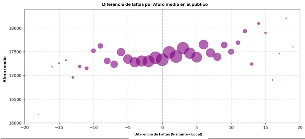 Por otra parte, quería observar el verdadero efecto de la presencia de según que árbitros a la hora de pitar el partido. En el estudio, se ve que los árbitros con un mayor número de partidos dirigidos tienden a concentrarse en la zona central de la distribución, mientras que aquellos con menos experiencia muestran una mayor dispersión en sus valores. No obstante, se observan diferencias relevantes entre algunos colegiados, lo que sugiere que esta variable puede resultar especialmente útil para explicar la cantidad de faltas señaladas en un partido. De hecho, hay algunos que incluso promedian más faltas personales pitadas al equipo local que al visitante.